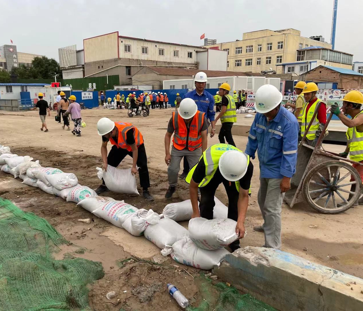 在中儲糧項目,施工現場地處低洼地段,防汛形勢嚴峻,項目部立即組織防汛排險隊,進行隱患排查,采取有效措施。一是夯實防汛堤壩。在重要出入口和低洼位置鋪設沙袋,阻擋雨水倒灌。抽水機滿負荷運轉,預防積水風險。二是開展防汛應急演練,組織全體建設者模擬開展對受損的水電設施進行全面排查修復,調配生活物資,增強現場施工人員防洪抗汛意識。