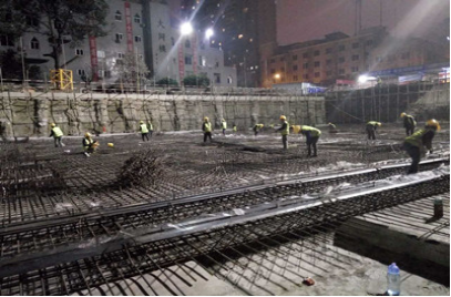 成都位于四川盆地西部的岷江中游地段,地質結構復雜,砂卵石地層居多,中間夾著細砂層。該項目的地基一半以上經過釬探后都需要把較軟的細砂層用卵石層換填,這對施工進度造成了較大影響。而且該工程位于金牛區茶店子橫街,屬于市區繁華地段,且屬于在原址上改擴建工程,師生們還集中在旁邊待建的教學樓內上課。所以,在狹小有限的場地內,要做到綠色環保施工,防止噪音擾民是該工程的又一大難點。為了取得周邊居民的理解和支持,項目部在居民區張貼了安民告示,并積極做好與居民的溝通;部分噪音大的分項工程與學生上課時間錯峰施工,材料選擇夜間進場,土方夜間挖運,每天加班至深夜十一二點。在項目部科學合理的統籌安排下,既保證了工程的快速推進,又達到了和諧、文明施工。