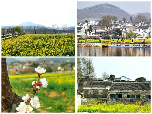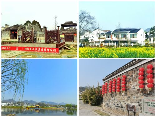 山水靈動,風光秀美,湖光山色盡收眼底。佘村座落于青龍山,黃龍山,橫山三山環抱之中。其南臨雙龍湖,湖水碧波蕩漾,野鴨悠閑自在地暢游,不時有水鳥從湖上掠過。湖邊的梅樹遒勁枝干上盛開著粉白色的花朵。極目遠眺,群山綿延,油菜花海一片,近處距今300多年的徽派古建筑群,一座座錯落有致的白墻黛瓦整潔的農居,儼然是一幅美麗田園的丹青畫卷。