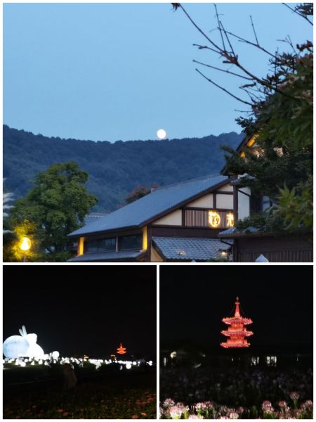夜色漸濃,月亮漸漸升起來,金黃的滿月掛在天邊。月色皎潔,對月凝望,思緒萬千。是啊,古人把滿月視為團圓的象征,尤其是客居他鄉的那些游子,更是以月寄托思鄉思念親人的片片深情。此時此刻,“舉頭望明月,低頭思故鄉”“露從今夜白,月是故鄉明”“春風又綠江南岸,明月何時照我還”的千古絕唱縈繞于耳畔。晚上8時,湖邊蓮花仙子水上表演開始,在震耳的音樂聲中,游客都擁到湖邊了“一飽眼福”。月色下,絢麗的燈光秀,七彩蓮花水上舞臺上,身著古裝服的演員的傾情表演,讓人嘆為觀止。在拈花灣小鎮這里,水上舞臺白天看是水上雕塑,夜晚則變身為水上舞臺,晚上的燈光表演,更是堪稱經典。