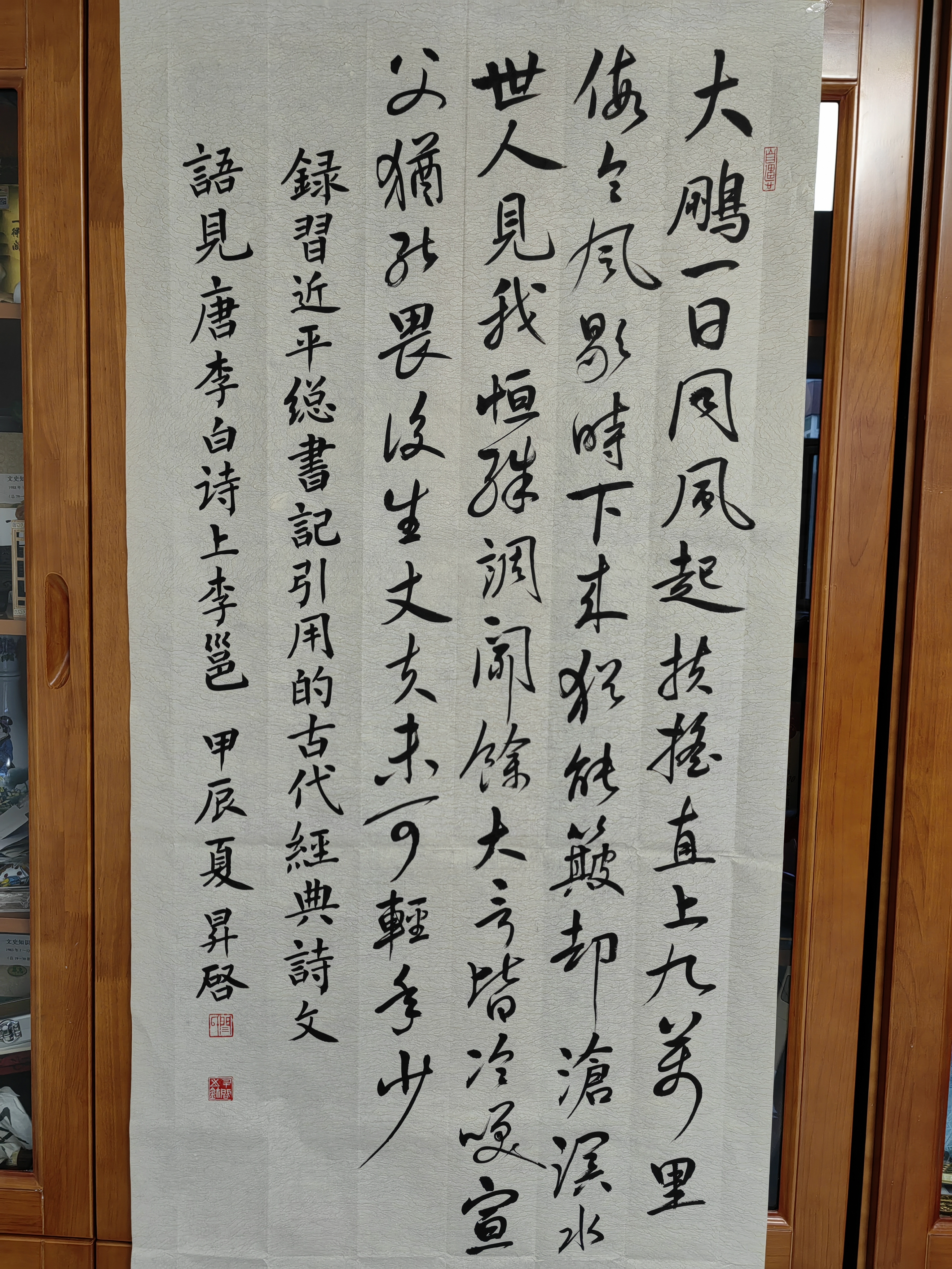 行書書法作品《上李邕》釋文:“大鵬一日同風(fēng)起,扶搖直上九萬里。假令風(fēng)歇時(shí)下來,猶能簸卻滄溟水。世人見我恒殊調(diào),聞?dòng)啻笱越岳湫ΑP釜q能畏后生,丈夫未可輕年少。”,