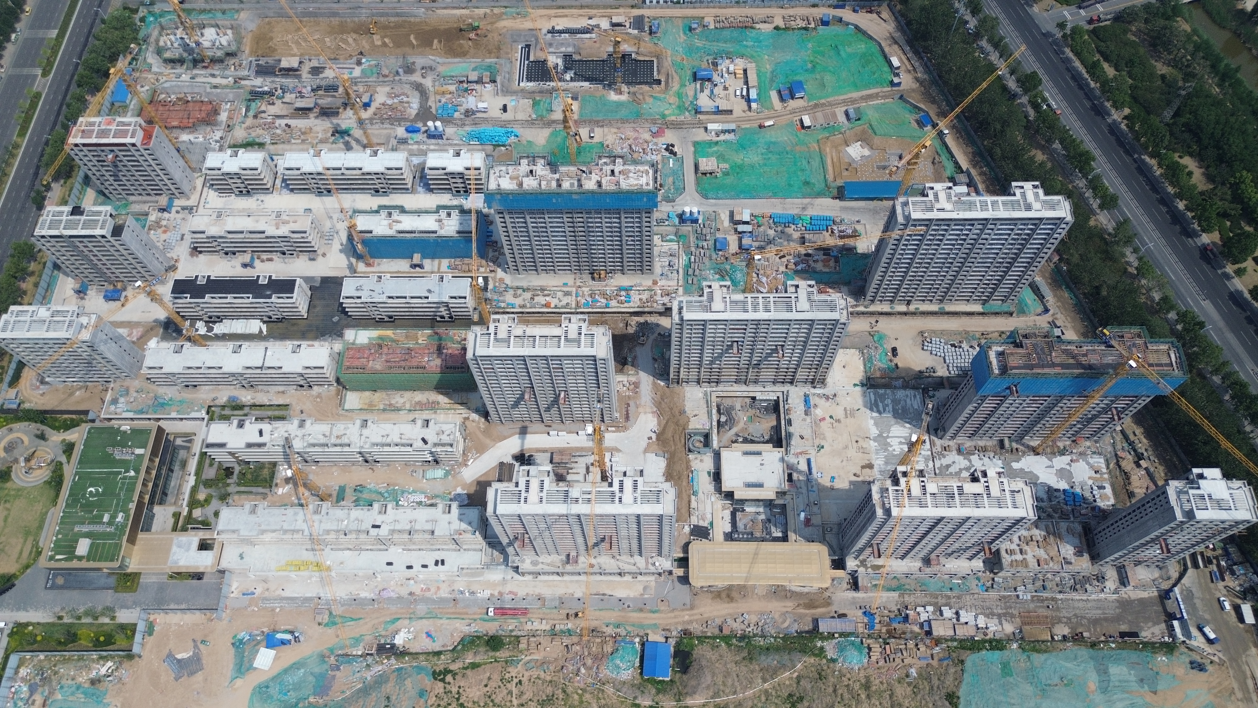 該工程位于山東省濱州市博興縣,樂安大街以東,原205國道以西,碧桂園星薈以北。項目建設用地面積約為22.35萬平方米,總建筑面積約52.45萬平方米。面對15棟單體建筑的復雜布局,施工團隊科學統籌工序,2025年4月已完成13棟封頂,剩余2棟同步推進主體工程,最終實現全面封頂目標。為保證項目建設質量,項目管理團隊采用三級質檢體系,嚴格執行“自檢、互檢、專檢”三檢制度,全面推行“樣板引路”標準化作業。在鋼筋工程中,團隊將鋼筋間距誤差精準控制在±5毫米以內,遠高于行業標準。