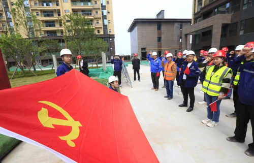 在辦實事、開新局環節,項目全體黨員在黨旗下重溫入黨誓詞,表示要踐行長征精神,建設人民滿意工程,更加堅定作為一名共產黨員的理想信念;活動中,中國二冶黨群工作部向黨員突擊隊和青年突擊隊授旗,各方代表表達了“踐行初心使命,認真履職盡責”的決心;全體職工簽下請戰書,紛紛表示將繼續充分發揚“一天也不耽誤,一天也不懈怠”的中冶精神,以求真務實、開拓創新的精神,把全部力量凝聚到項目建設中來,向成都市人民交出一份滿意的答卷,隨后,各方代表圍繞安全環保、項目建設、工程質量、工程進度等情況進行充分探討,對中國二冶董家埂社區工程的建設亮點進行深入了解。