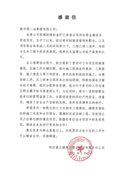 阿拉善左旗珠拉黃金開發有限責任公司在感謝信中指出,在工期緊、任務重的情況下,項目部在跟進進度的同時,嚴把安全質量關,確保了安全生產目標的實現,是所有參建單位中的標桿。