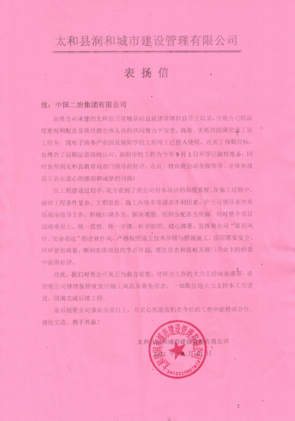信中太和縣潤和城市建設管理有限公司對中國二冶在各方面的工作支持深表感謝,希望中國二冶繼續(xù)保持優(yōu)良的施工風范及服務理念,一如既往地大力支持該工程建設,圓滿完成后續(xù)工程。并表示愿與中國二冶集團有限公司在今后的工作中能精誠合作,共鑄輝煌!