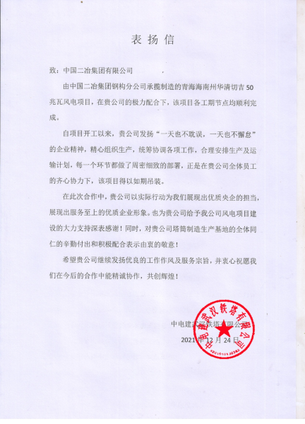 12月24日,中電建武漢鐵塔有限公司給中國二冶發來表揚信,贊譽其在青海海南州華清切吉50兆瓦風電項目中所表現出的優秀管理水平和優良的履約能力。