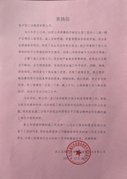 12月29日,沈丘縣城區改造建設投資開發有限公司向中國二冶發來表揚信,對中國二冶各級領導給予工程高度重視和大力支持表示衷心感謝,對該項目自開工建設以來,項目部全體人員所付出的努力和艱辛給予肯定和表揚。