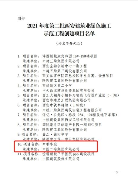 12月30日,由中國二冶承建的中譽華庭項目榮獲“2021年度第二批西安建筑業綠色施工示范工程”稱號。