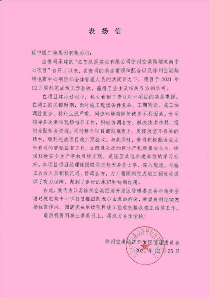 12月30日,中國二冶收到徐州空港經(jīng)濟(jì)開發(fā)區(qū)管委會表揚(yáng)信,對項(xiàng)目于12月25日順利完成竣工預(yù)驗(yàn)收給予表揚(yáng),對中國二冶徐州空港跨境電商中心項(xiàng)目管理團(tuán)隊(duì)表示由衷的感謝。信中寫到,在項(xiàng)目建設(shè)過程中,我方看到了貴司對本項(xiàng)目的高度重視. 在施工的關(guān)鍵時期,面對施工現(xiàn)場條件復(fù)雜、工期緊張、施工協(xié)調(diào)性復(fù)雜、材料上漲嚴(yán)重、周邊環(huán)境簡陋等諸多不利因素,貴司領(lǐng)導(dǎo)多次親臨現(xiàn)場指導(dǎo)工作,積極協(xié)調(diào)各方、解決技術(shù)難題。同時整個項(xiàng)目團(tuán)隊(duì)迎難而上、發(fā)揮攻堅(jiān)不畏難的精神,順利完成項(xiàng)目竣工預(yù)驗(yàn)收,是園區(qū)其他參建單位的學(xué)習(xí)標(biāo)桿。