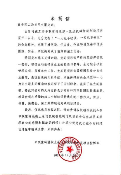 12月27日,中聯(lián)重科混凝土泵送機(jī)械智能制造項(xiàng)目指揮部向中國二冶致表揚(yáng)信,對中國二冶項(xiàng)目部安全高效的完成項(xiàng)目前期施工任務(wù)表示感謝。信中指出,在施工關(guān)鍵時期,中國二冶中聯(lián)重科項(xiàng)目部嚴(yán)格按照指揮部統(tǒng)一安排,積極主動地接受業(yè)主的檢查與督導(dǎo),全力配合項(xiàng)目管理公司、監(jiān)理單位工作。特別是項(xiàng)目管理團(tuán)隊(duì)處處為業(yè)主著想及吃苦耐勞,頑強(qiáng)拼搏的工作作風(fēng)給我們留下了深刻印象,贏得了各方的稱贊。希望中國二冶項(xiàng)目團(tuán)隊(duì)在后續(xù)的施工中繼續(xù)保持優(yōu)良的工作作風(fēng),保質(zhì)、保量、保安全、保工期的順利完成項(xiàng)目建設(shè)任務(wù)。