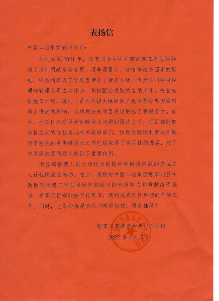 張家川回族自治縣中醫(yī)院對中國二冶張家川項目部管理人員積極協(xié)助業(yè)主解決醫(yī)院供電供暖供水問題給予表揚。信中寫到,中國二冶項目經理部管理人員主動作為,積極配合院里的各項工作,妥善安排施工計劃,通過一系列舉措大幅降低了疫情等外界因素對施工進度的影響,為順利完成項目建設做出了積極貢獻。此外,在項目深受供電供暖供水問題的困擾之下,項目部能夠積極主動地尋找當地相關政府部門,協(xié)助張家川縣中醫(yī)院順利解決問題,目前醫(yī)院供電供暖供水工作已經取得了實質性進展,為中醫(yī)院順利喬遷起到了積極推動作用。