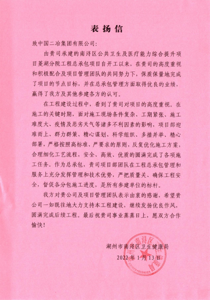 1月15日,中國二冶收到湖州市南潯區(qū)衛(wèi)生健康局表揚信,信中對中國二冶路橋分公司菱湖分院項目部在工程總承包管理和服務上充分發(fā)揮管理和技術優(yōu)勢,嚴把質(zhì)量關、確保工程安全,全力搶抓施工進度予以肯定。