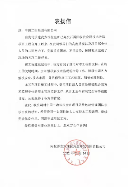 1月17日,中國二冶連續收到來自河北省邢臺市信都區城市管理局和阿拉善左旗珠拉黃金開發有限責任公司表揚信,對中國二冶在項目建設中高度的責任與擔當、優秀的專業素質和過硬的技術水平表示肯定,對項目部高質量、超進度、零污染、零事故完成既定目標予以表揚和由衷的感謝。