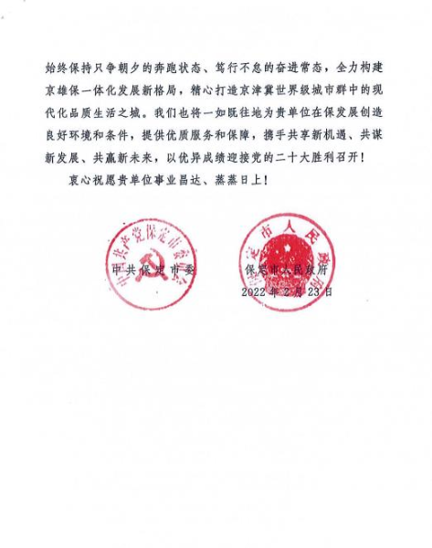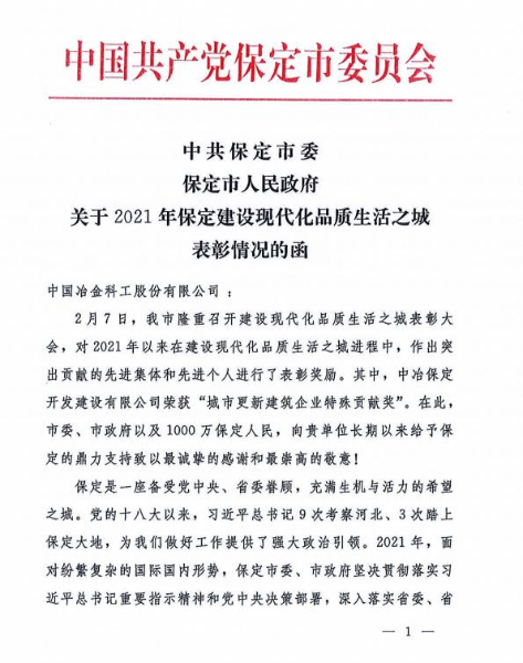 3月7日,中國二冶收到保定市委、市政府發來的《關于2021年保定建設現代化品質生活之城表彰情況的函》。函中對包括中國二冶集團在內的中冶集團各參建單位在2021年保定建設現代化品質生活之城進程中作出的積極貢獻表示感謝。