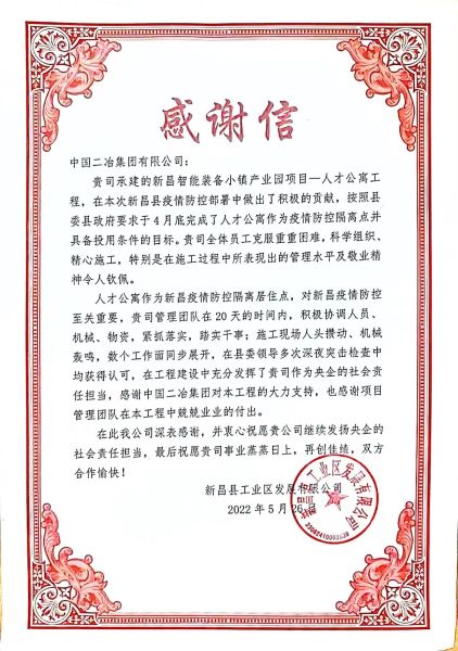 5月30日,中國二冶收到業主方新昌縣工業區發展有限公司發來的感謝信,對中國二冶在新昌智能裝備小鎮人才公寓項目建設中全體人員兢兢業業、敢打敢拼的奮斗精神予以肯定,對在疫情形勢下保障該項目施工節點所做出的卓越貢獻表示感謝。