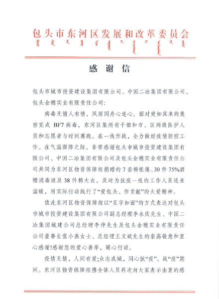感謝信中寫道,面對突如其來的新冠肺炎疫情,全市廣大共產黨員、醫護人員、公安干警、下沉干部、社區工作者、防疫志愿者等,以“一家不圓萬家圓”的奉獻精神,以“不教胡馬度陰山”的英雄氣概,不懼風險,不舍晝夜,不辭辛勞,持續奮戰在醫療服務、隔離管控、交通卡點、流調排查、核酸檢測、物資配送、消殺保潔等戰線上,為全市打贏疫情防控攻堅戰作出突出貢獻。中國二冶主動踐行抗疫精神,勇于擔當,星夜兼程完成3個疫情防控隔離點改造建設任務,疫不容辭、奮力搶拼包頭市防疫隔離點項目建設任務,及時向東河區政府捐贈防疫物資,為抗疫一線工作人員送去溫暖,為包頭市東河區疫情防控工作提供有力保障,彰顯了中國二冶“愛包頭、做貢獻”大愛無疆的奉獻精神,充分體現了新時代駐包央企的新擔當新作為。疫情面前,聞令而動,毅然逆行,勇挑重任,全力以赴,讓黨旗在包頭市疫情防控一線高高飄揚。再次感謝中國二冶的愛心善舉,暖心行動。感謝中國二冶干部職工,用一腔忠誠和熱血,用骨子里的澎湃激情凝聚成打贏這場疫情阻擊戰的強大合力!病毒無情人有情,風雨同舟向前進,危難之際顯身手。