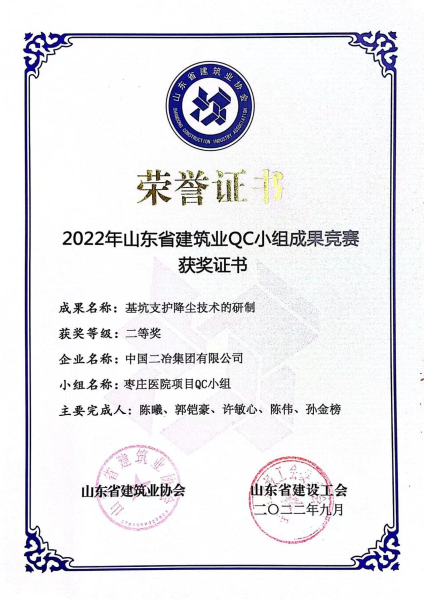 11月7日,由山東省建筑業協會和山東省建設工會聯合開展的2022年度山東省建筑業QC小組成果競賽活動成績揭曉,中國二冶山東分公司棗莊人民醫院項目部QC小組研究課題《基坑支護降塵技術的研制》在活動中榮獲二等獎。