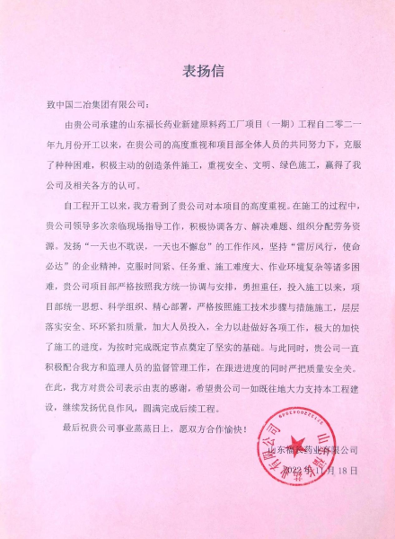 表揚信指出,山東福長藥業新建原料藥工廠(一期)項目自二零二一年九月開工以來,經過一年多的艱苦施工,項目管理團隊克服困難、積極配合,取得階段性成功。中國二冶項目管理人員團結一心、統一思想、科學組織、精心部署,發揚“一天也不耽誤,一天也不懈怠”的企業精神,堅持“雷厲風行、使命必達”的工作作風,積極協調各方解決技術難題,及時調整、編制各項施工方案,組織分配人、材、機,保障物資供應。自施工以來,嚴格按照施工技術步驟與措施,層層落實安全,環環緊扣質量,極大地加快了施工進度,充分體現了央企的責任心和服務意識。