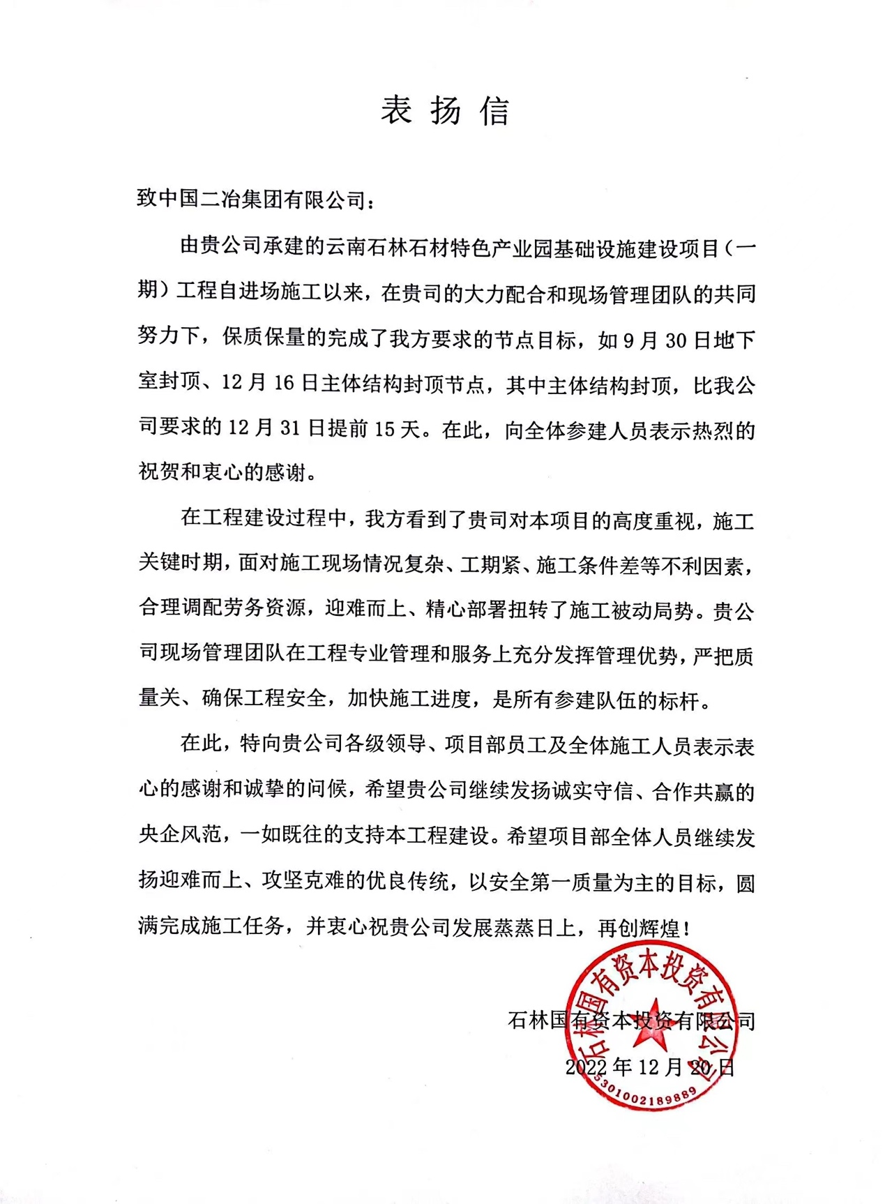 12月22日,中國二冶路橋分公司云南石林石材產(chǎn)業(yè)園項目又一次收到來自石林國有資本投資有限公司的表揚(yáng)信,這是自十月以來項目收到的第二封建設(shè)單位表揚(yáng)信,兩封表揚(yáng)信不僅是對項目管理團(tuán)隊鼓勵和肯定,也是對中國二冶做為國家建設(shè)主力軍的高度認(rèn)可。