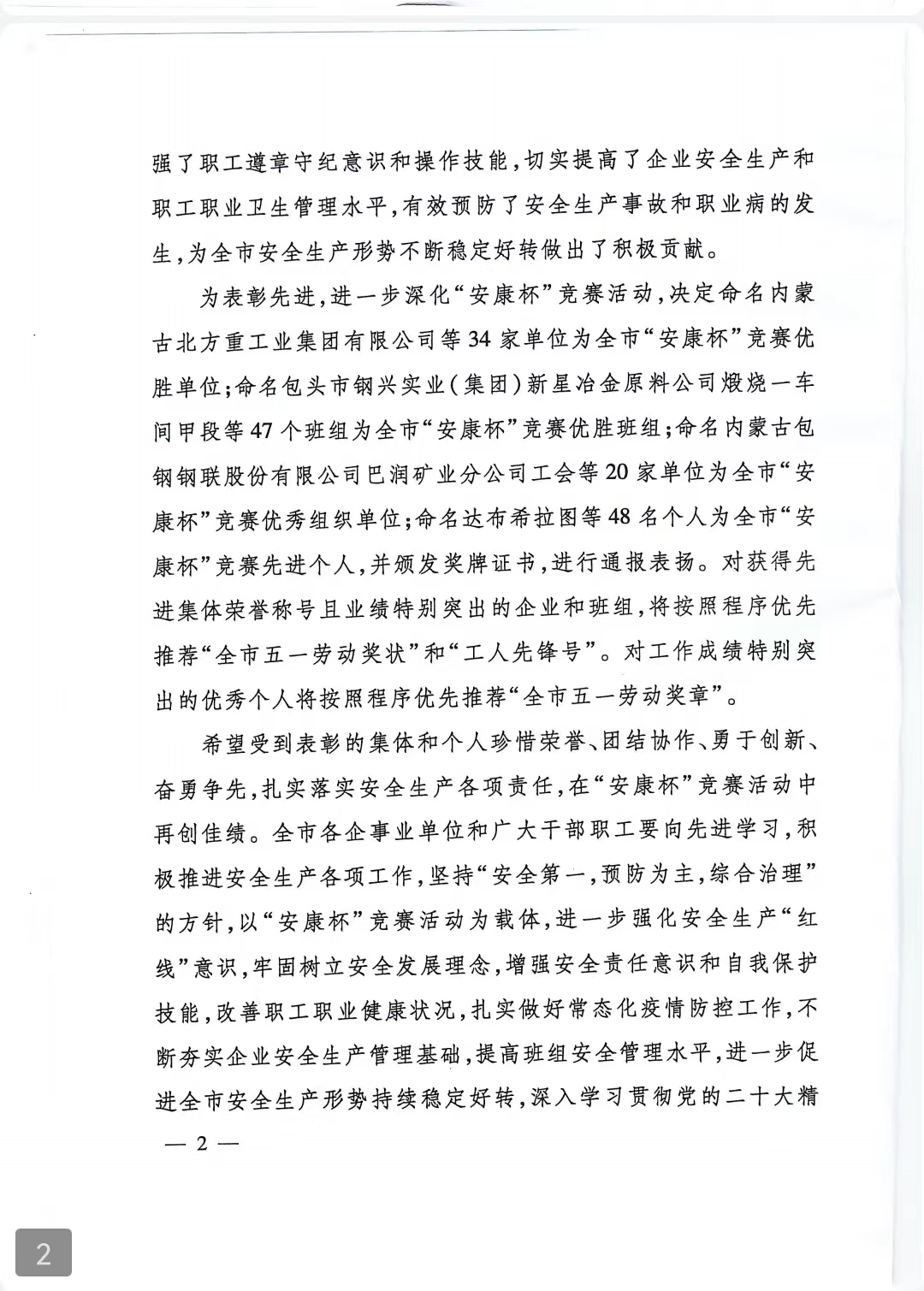 “安康杯”競賽活動是由包頭市總工會和包頭市應急管理部及包頭市衛生健康委員會聯合組織的安全生產競賽評比活動,旨在通過競賽安全生產管理、領導者安全生產意識、職工安全生產知識水平和能力、安全生產各項指標評比,不斷推動企事業單位的安全生產工作和安全文化建設,不斷擴大社會影響,提高全民安全生產意識,最終降低各類事故的發生率和各類職業病的發病率。