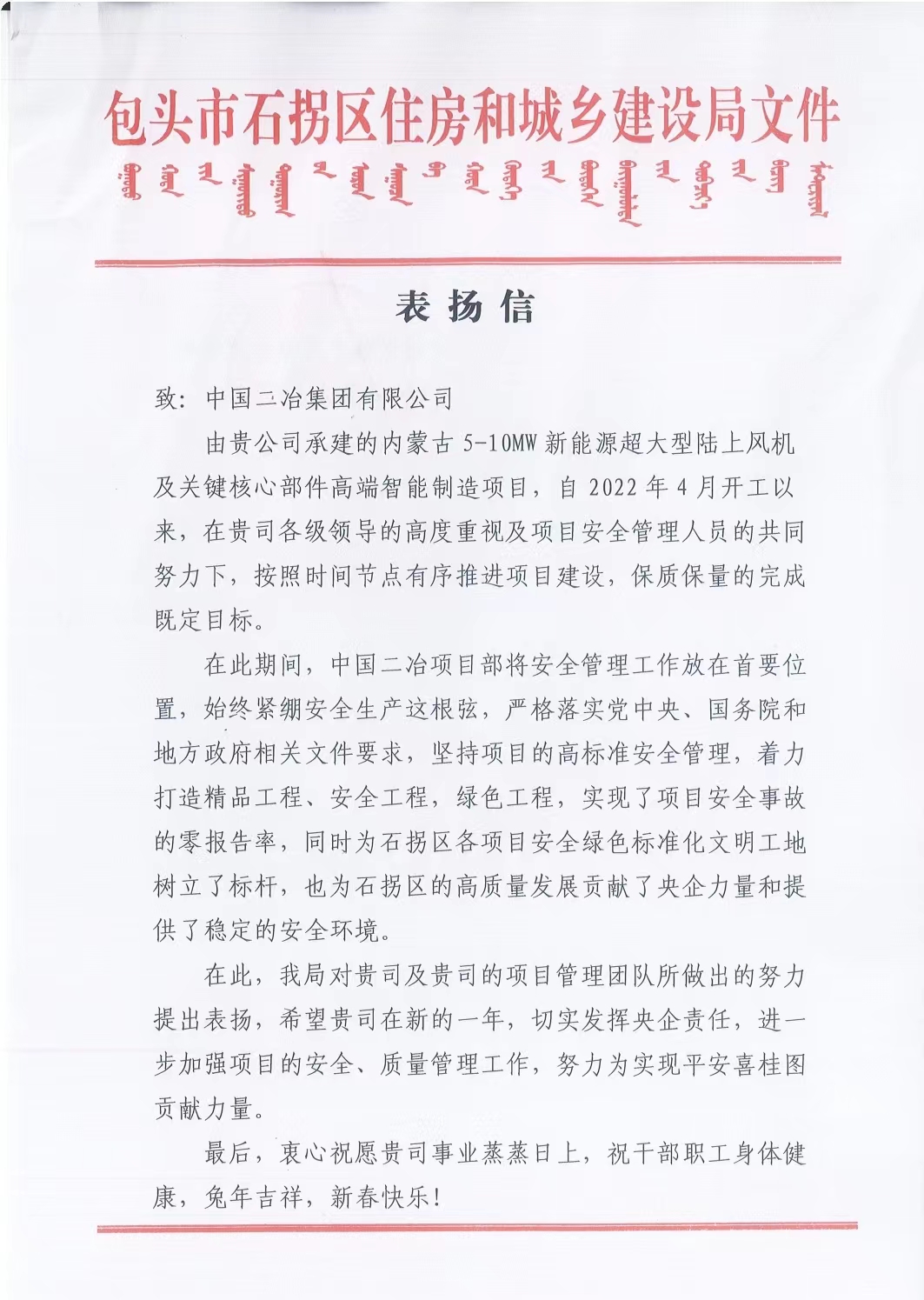 在表揚信中,衷心祝愿中國二冶事業(yè)蒸蒸日上,祝干部職工身體健康,兔年吉祥,新春快樂!