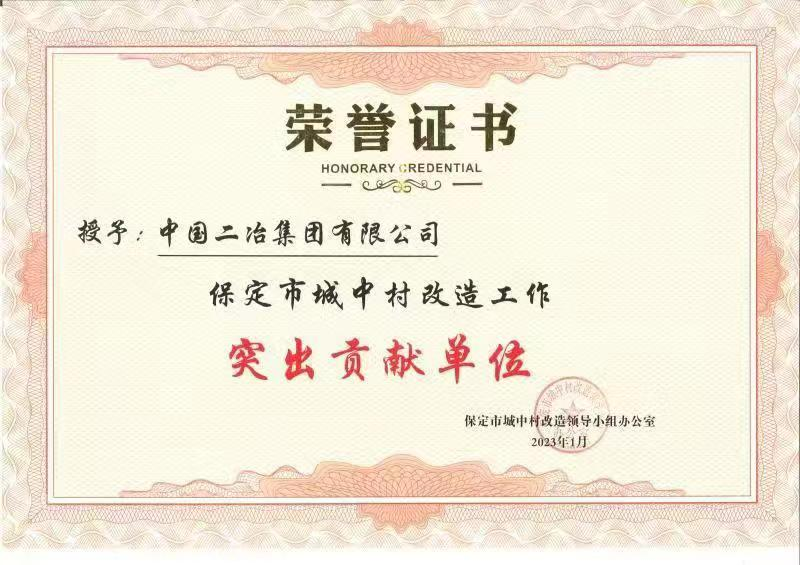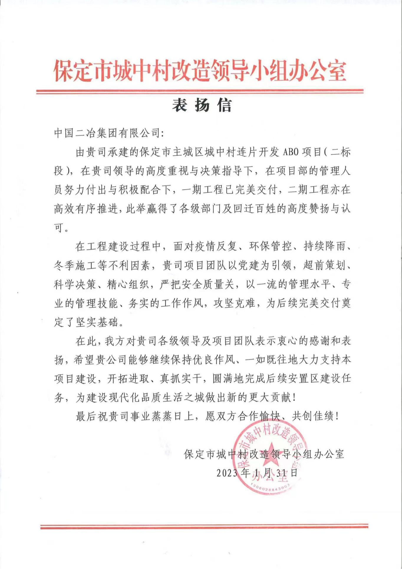 1月31日,中國二冶收到保定市城中村改造領導小組辦公室的表揚信,并被授予保定市城中村改造工作突出貢獻單位。