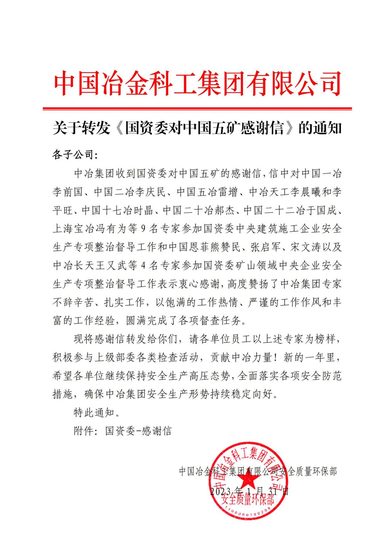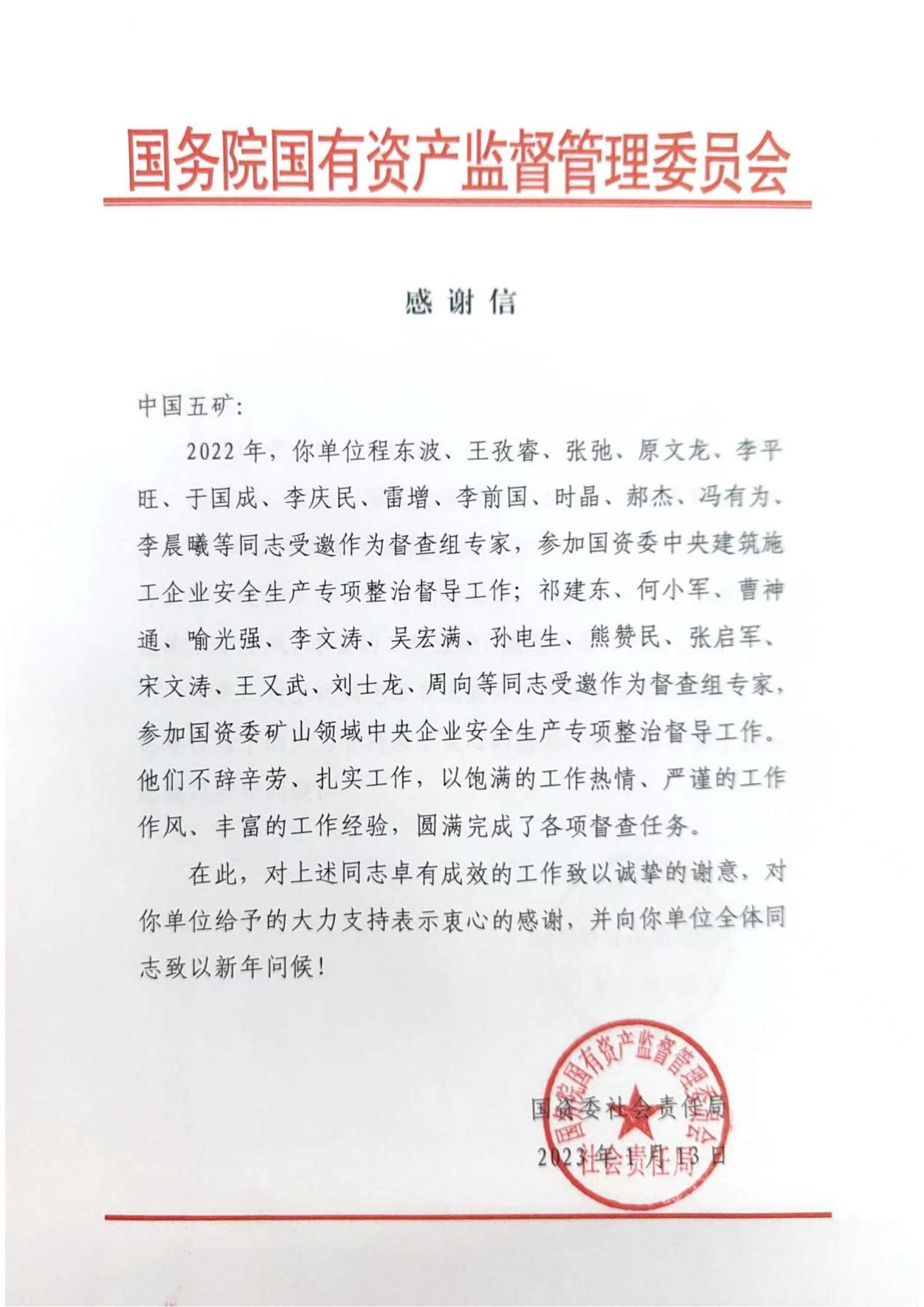2月5日,中國(guó)二冶收到中冶集團(tuán)轉(zhuǎn)發(fā)由國(guó)資委發(fā)給中國(guó)五礦的感謝信,感謝信對(duì)包括中國(guó)二冶內(nèi)蒙古分公司安全總監(jiān)李慶民在內(nèi)的9名中冶專(zhuān)家參加國(guó)資委中央建筑施工企業(yè)安全生產(chǎn)專(zhuān)項(xiàng)整治督導(dǎo)工作表示衷心感謝,對(duì)中冶集團(tuán)專(zhuān)家不辭辛苦、扎實(shí)工作,以飽滿(mǎn)的工作熱情、嚴(yán)謹(jǐn)?shù)墓ぷ髯黠L(fēng)和豐富的工作經(jīng)驗(yàn),圓滿(mǎn)完成了各項(xiàng)督查任務(wù)表示高度贊揚(yáng)。