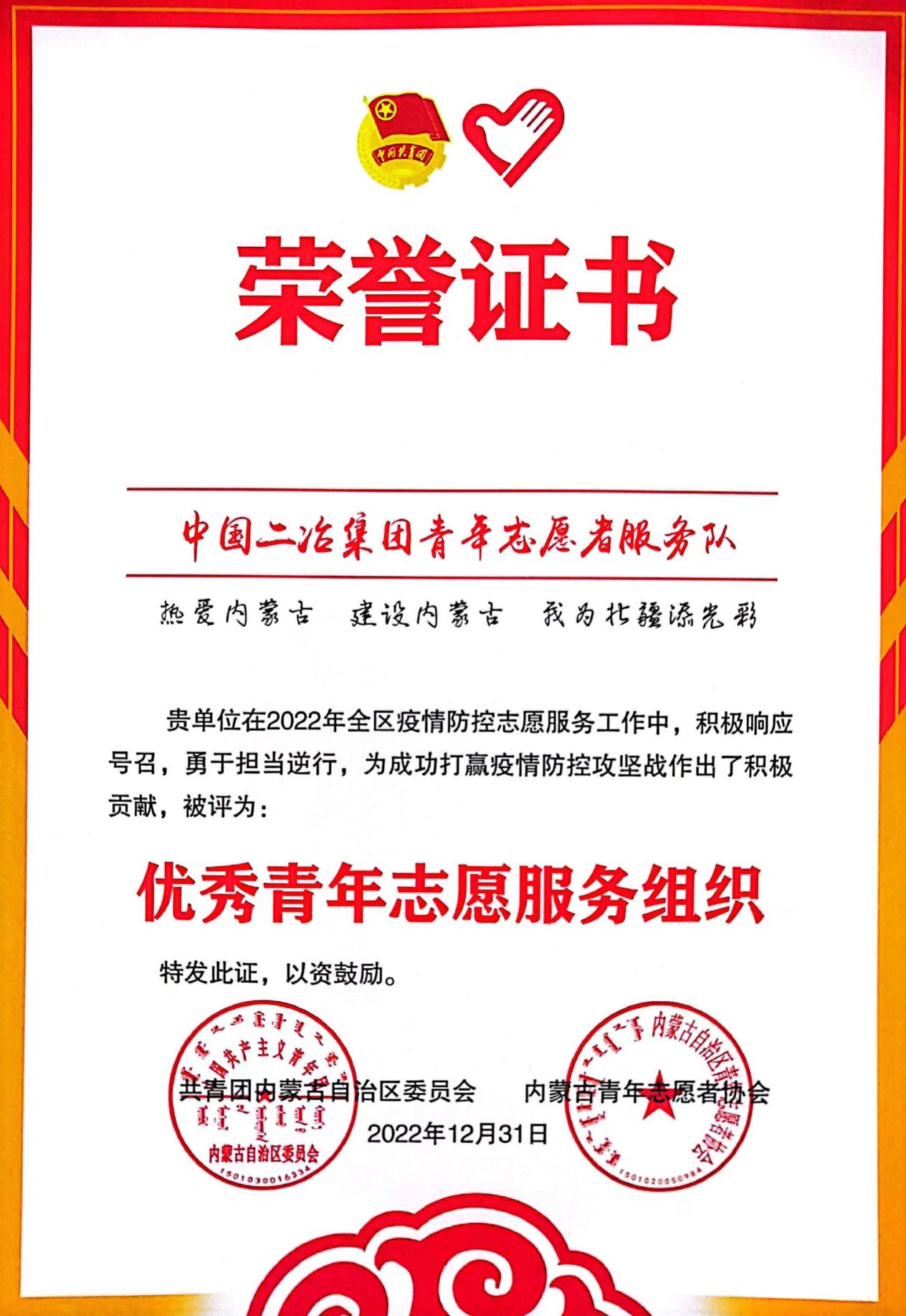 2月13日,共青團內蒙古自治區委員會、內蒙古青年志愿者協會授予中國二冶集團青年志愿服務隊“優秀青年志愿服務先進集體”榮譽稱號。褒揚中國二冶青年志愿服務隊在抗擊新冠肺炎疫情中的突出表現。