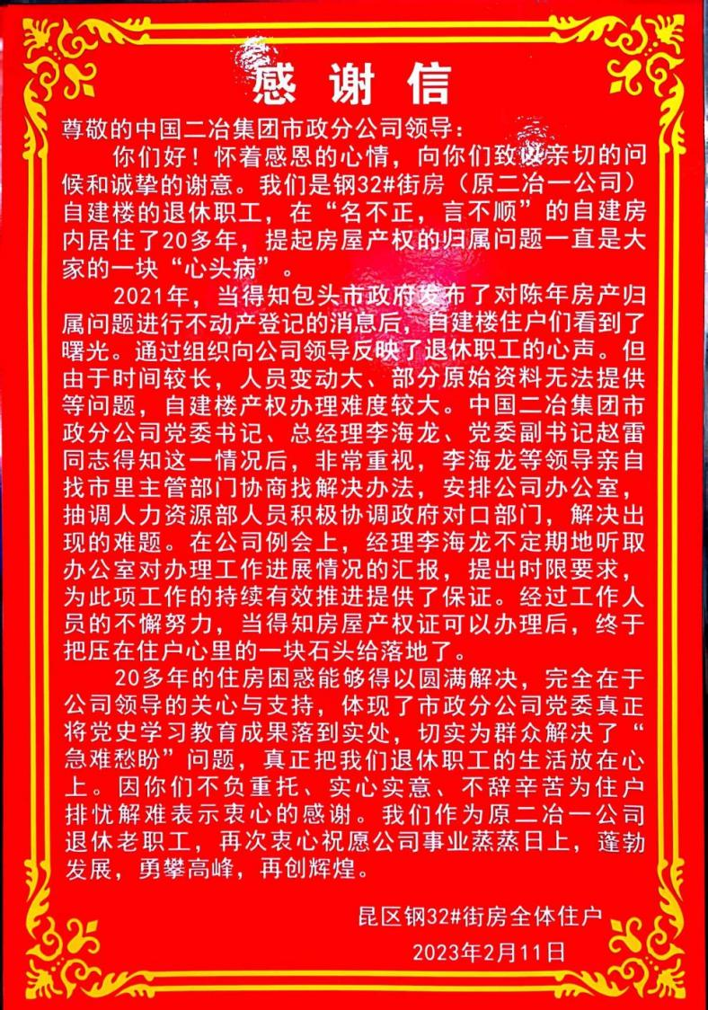 信中指出,自得知鋼32#街坊(原二冶一公司)自建樓退休職工面臨的產權辦理困難后,中國二冶市政分公司黨委高度重視,迅速行動,第一時間組建專職小組,圍繞群眾問題進行溝通解決。由于時間較長、人員變動大、部分原始資料無法提供等問題,自建樓產權辦理難度較大。領導班子親自掛帥,多次前往包頭市主管部門協商,迅速打開解決困難的突破口,積極與政府相關部門溝通,解決辦理產權的具體問題。經過全體人員的不懈努力,鋼32#街坊自建樓退休職工產權辦理工作圓滿完成,終于搬開了壓在住戶心里20多年的一塊“巨石”,解決了退休職工的一塊“心頭病”。鋼32#街坊的退休職工作為原二冶一公司的一員,親身經歷了中國二冶一路走來所經歷的風雨與艱辛,親眼見證了中國二冶的迅速發展與壯大。此次問題的圓滿解決,充分展現出中國二冶作為駐包央企的責任與擔當,體現出世代二冶人的歷史傳承與深厚根基。