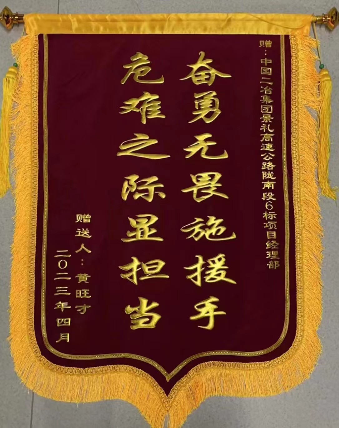 4月26日下午,中國二冶景禮項(xiàng)目部收到隴南市禮縣永坪鎮(zhèn)派出所民警送來寫有“奮勇無畏施援手,危難之際顯擔(dān)當(dāng)”的錦旗,向景禮項(xiàng)目員工勇救落水婦女的感人事跡表示感謝并給予高度贊揚(yáng)。
