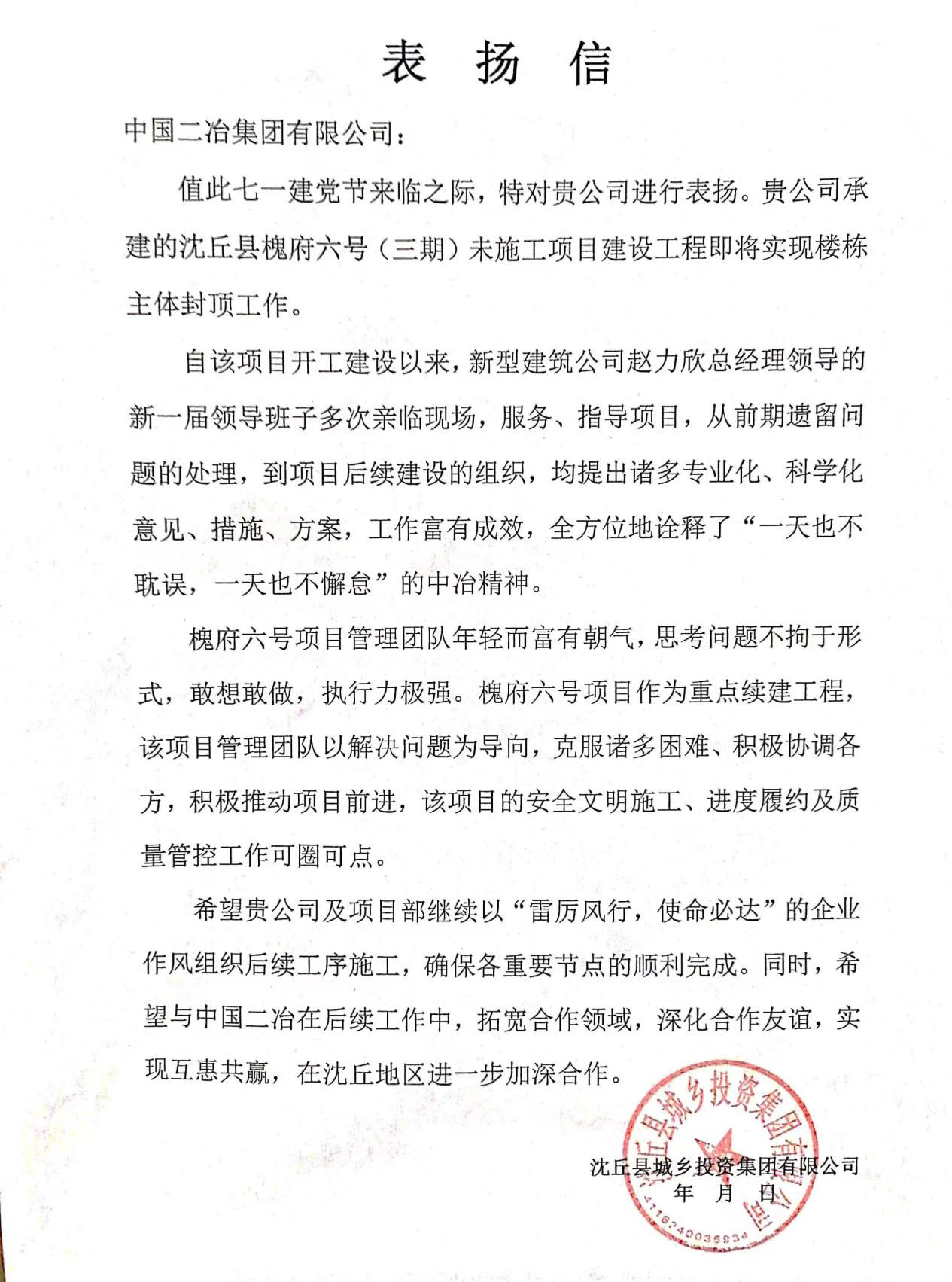 6月19日,中國(guó)二冶收到沈丘縣城鄉(xiāng)投資集團(tuán)有限公司表?yè)P(yáng)信,對(duì)槐府六號(hào)項(xiàng)目即將實(shí)現(xiàn)樓棟主體封頂?shù)南踩顺煽?jī)表示贊許。