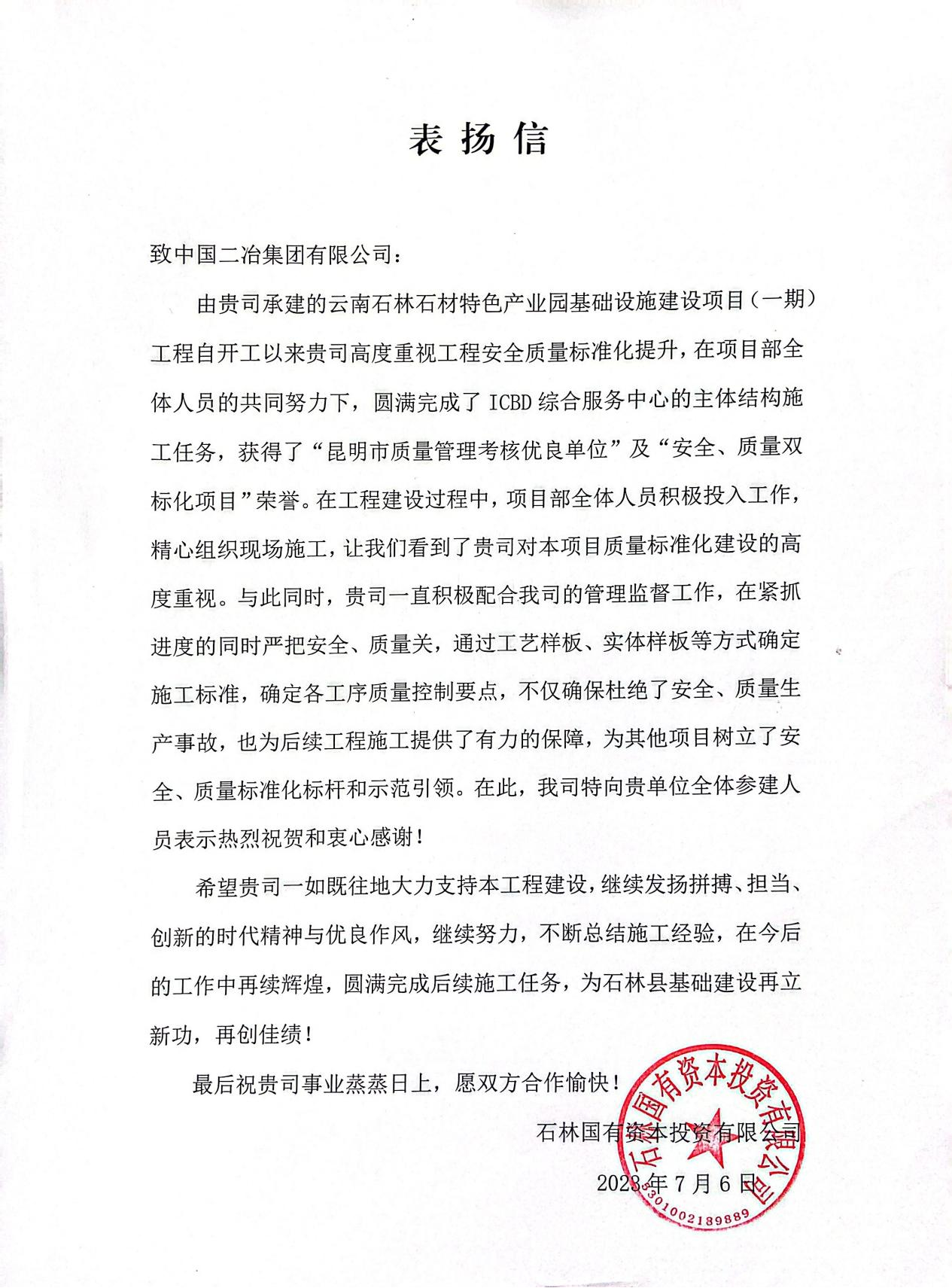 7月6日,中國二冶石林產業園項目收到業主單位表揚信,對石林產業園項目在工程建設任務中表現出的優質施工、精細管理以及誠信履約予以高度認可,對項目管理團隊表示由衷感謝,并祝賀石林產業園項目獲得“質量考核優良單位”“安全、質量雙標化工地”榮譽。