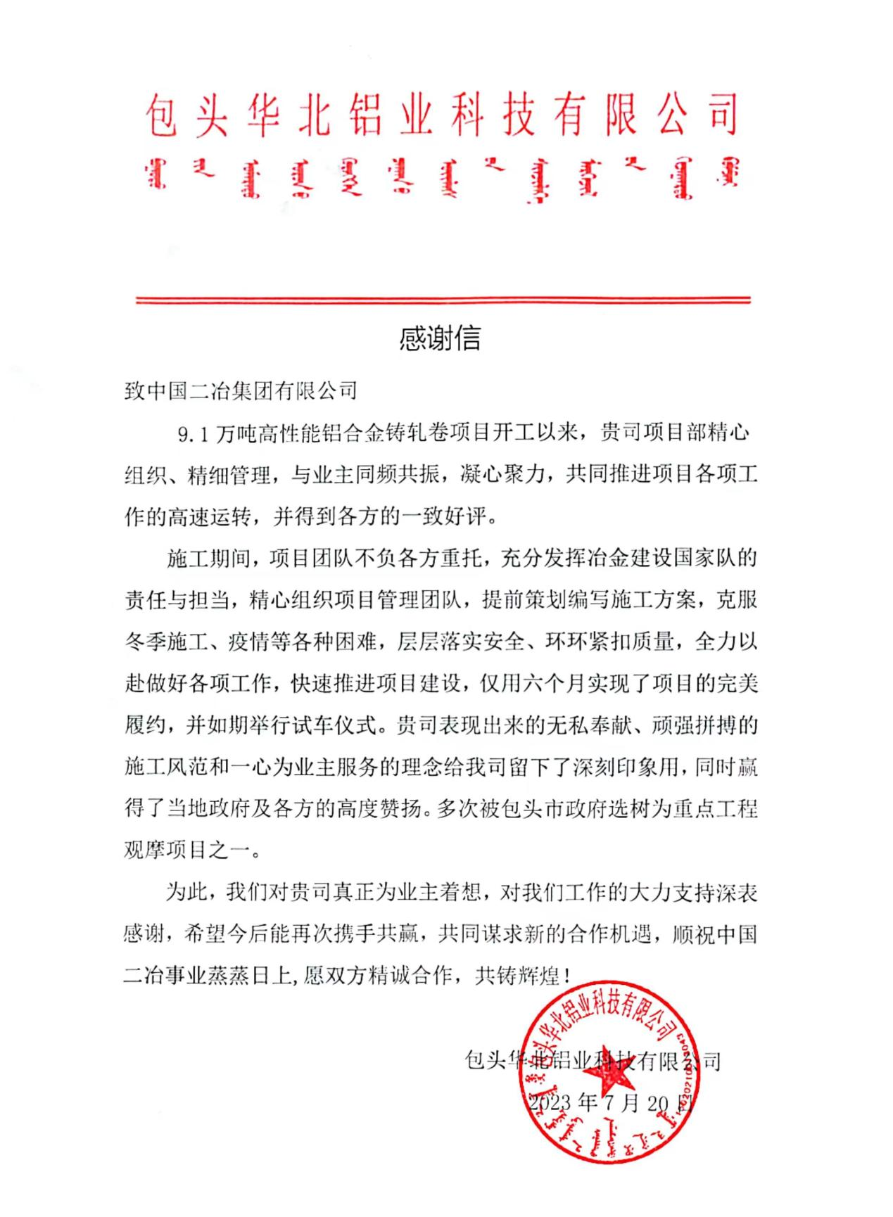 7月20日,中國二冶收到來自包頭華北鋁業(yè)科技有限公司的感謝信,信中對中國二冶承建的包鋁9.1萬噸高性能鋁合金鑄軋卷項目做出的貢獻表示感謝。