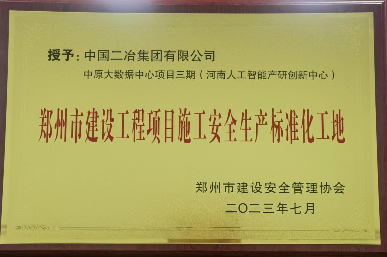 7月22日,由中國二冶中原分公司承建的中原大數據中心項目三期(河南人工智能產研創新中心)建筑工程施工總承包項目經理部獲評鄭州市2023年建設工程項目施工安全生產標準化工地稱號。