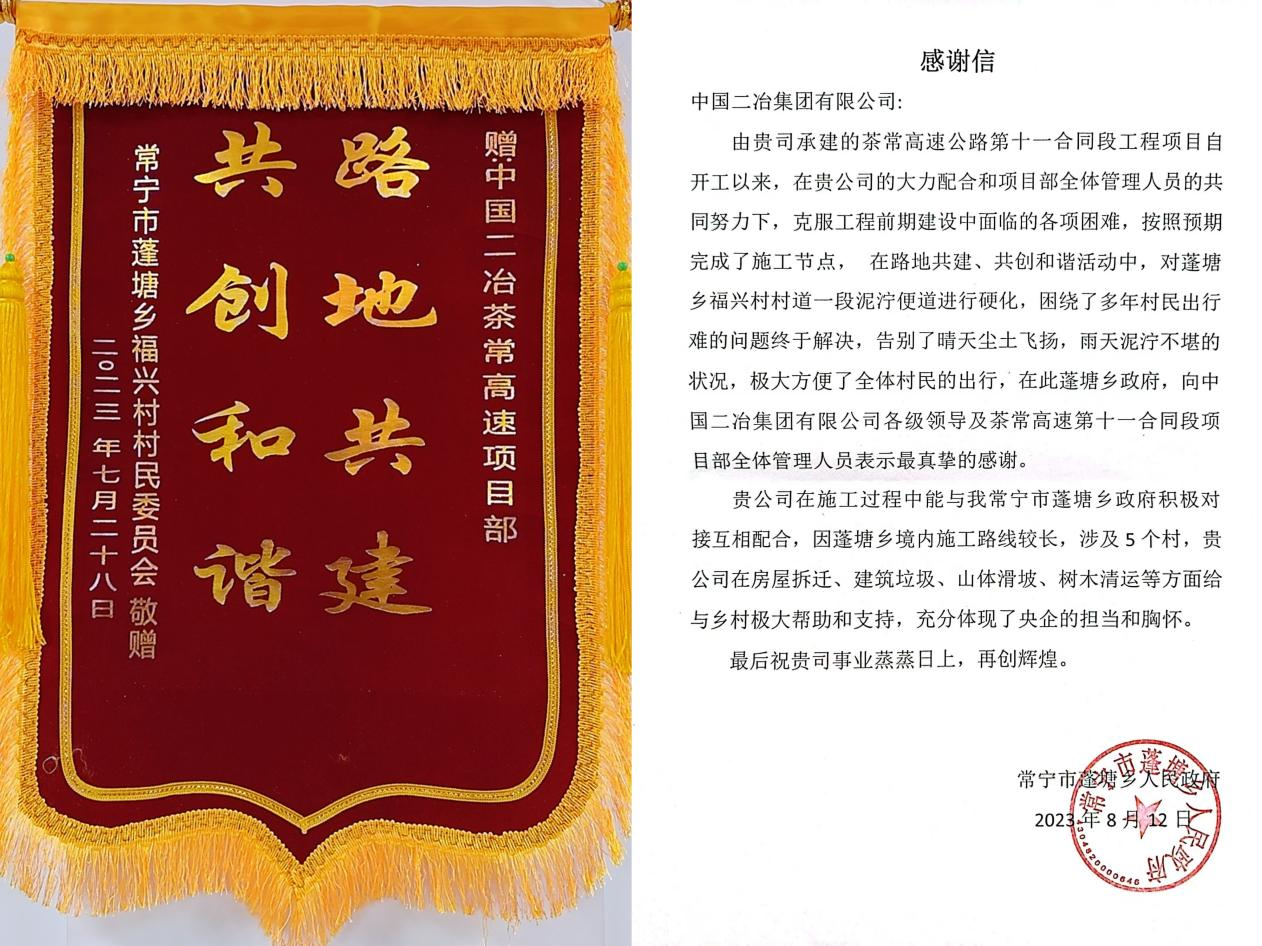 8月13日,中國二冶收到來自常寧市蓬塘鄉(xiāng)人民政府錦旗和感謝信,對(duì)中國二冶茶常高速第11合同段項(xiàng)目在當(dāng)?shù)爻浞职l(fā)揮央企的責(zé)任與擔(dān)當(dāng)表示感謝。