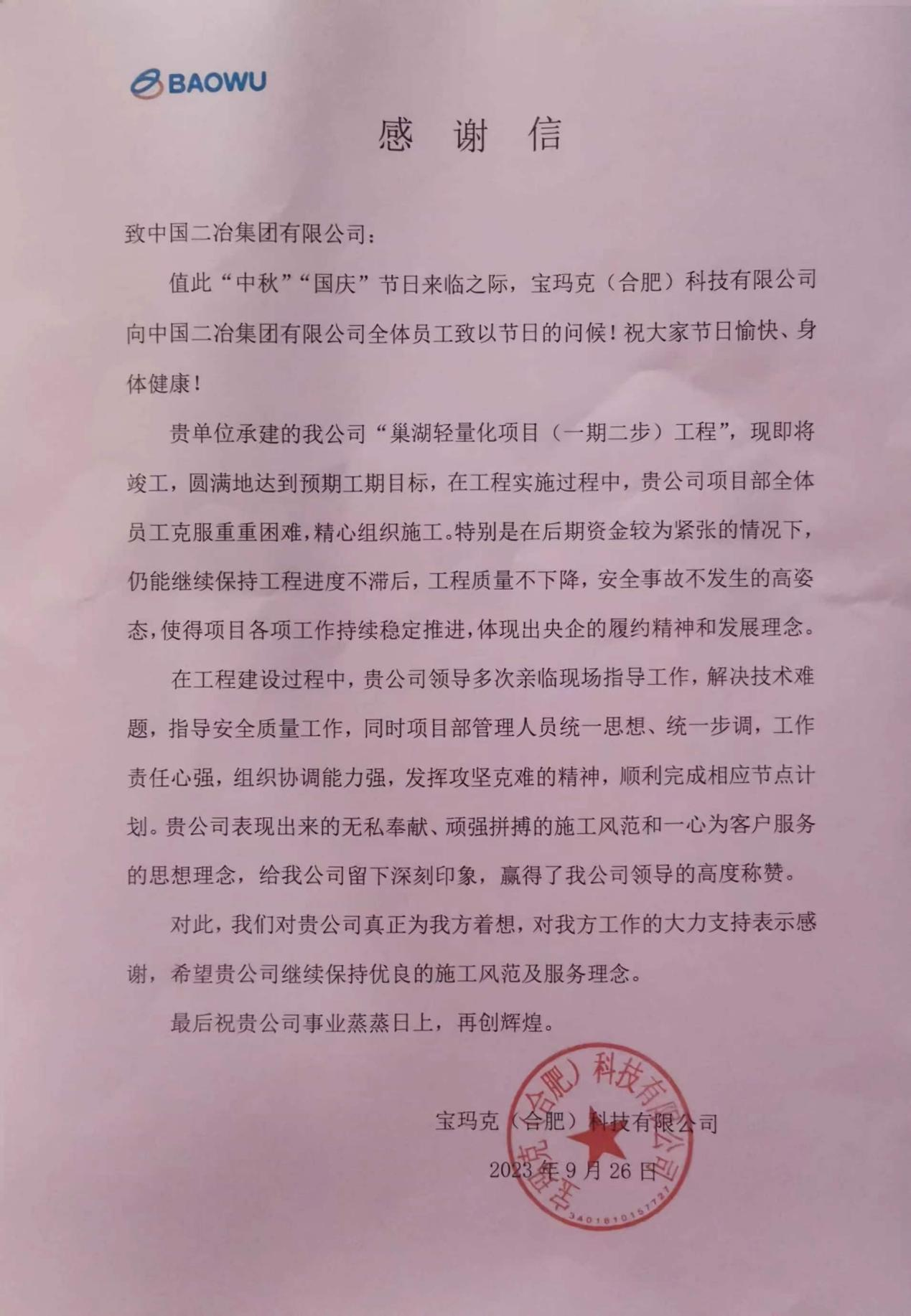 9月26日,中國二冶巢湖輕量化項目收到寶瑪克(合肥)科技有限公司感謝信,對中國二冶保質、保量按期完成工程全部施工任務表示真誠的感謝和由衷的敬意。