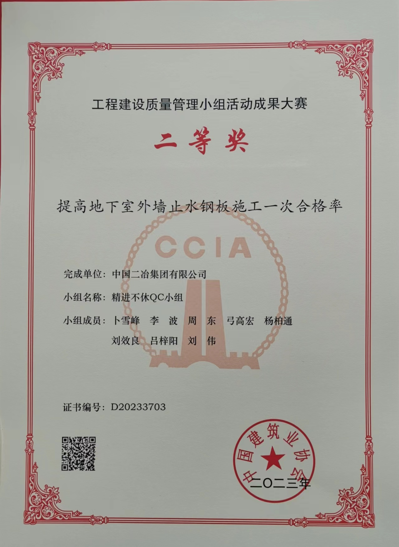 9月25日,中國二冶《提高地下室止水鋼板施工一次合格率》QC成果在中國建筑業協會舉辦的工程建設質量管理小組活動成果大賽中榮獲二等獎。