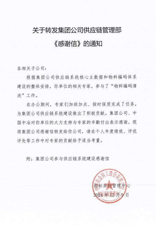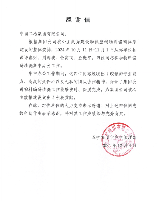 信中指出,根據(jù)集團(tuán)公司核心主數(shù)據(jù)建設(shè)和供應(yīng)鏈物料編碼體系建設(shè)的整體安排,2024年10月11日-11月1日從你單位抽調(diào)許鑫財、劉海波、任高飛、金曉宇,四位同志參加物料編碼清洗集中辦公工作。集中辦公工作期間,這四位同志展現(xiàn)出了較強的專業(yè)能力、高度的責(zé)任心以及無私的團(tuán)隊協(xié)作精神,保證了集團(tuán)公司物料編碼清洗工作能夠按時、保質(zhì)完成,為集團(tuán)公司核心主數(shù)據(jù)建設(shè)做出了積極貢獻(xiàn)。
