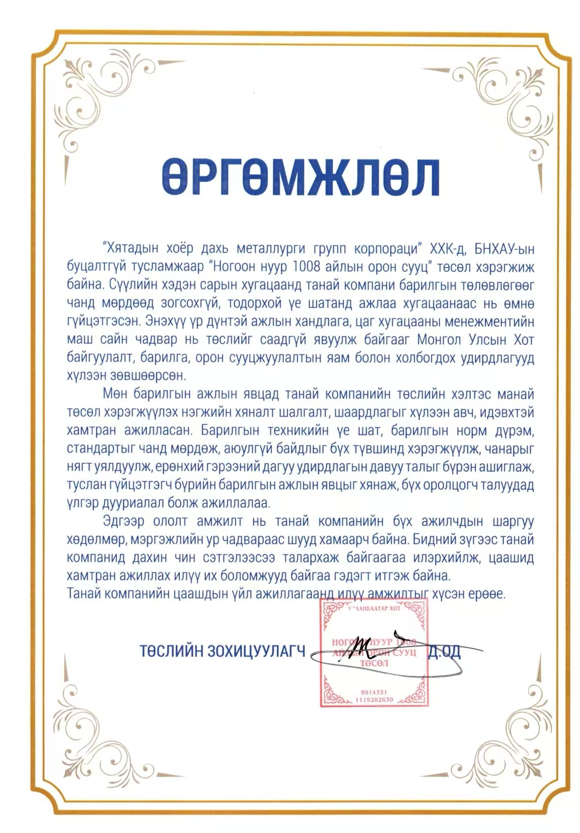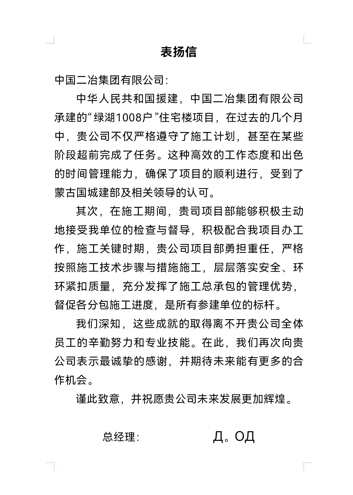 表揚信指出,由中華人民共和國援建、中國二冶承建的“綠湖1008戶”住宅樓項目遵守施工計劃,在重要節點重要工序超前完成了施工任務,受到了蒙古國城建部及相關領導的認可。施工期間,項目部能夠主動接受檢查與督導,積極配合,協同發力,尤其是施工關鍵時期,項目部勇擔重任,嚴格按照工程技術、設計規范、施工步驟與措施,層層落實安全、環保責任,緊扣質量標準,抓實分部分項工程質量,充分發揮了施工總承包方的管理優勢,全方位督促各分包施工進度,加快項目建設步伐,是所有參建單位的標桿,充分彰顯了中國央企的實力。