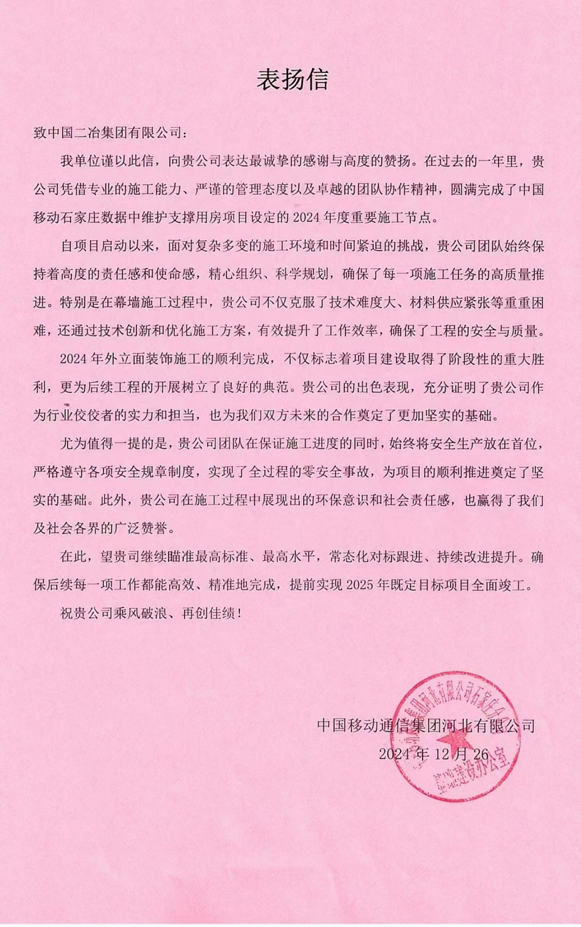 12月27日,中國二冶收到一封來自中國移動(dòng)河北分公司的表揚(yáng)信,信中對公司在項(xiàng)目施工中所展現(xiàn)出的綜合實(shí)力表示肯定。