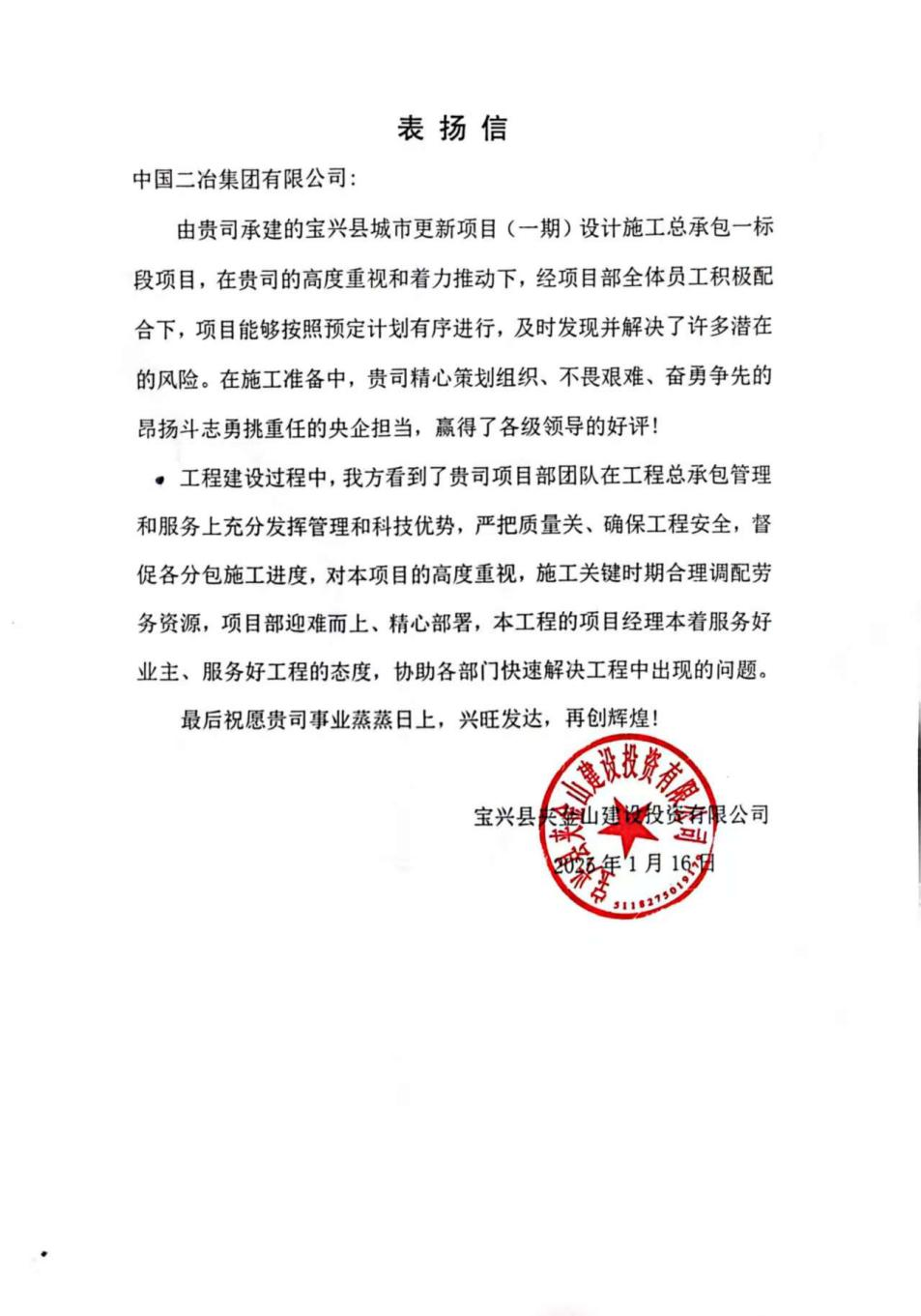 此次收到表?yè)P(yáng)信,不僅是對(duì)寶興縣城市更新項(xiàng)目管理團(tuán)隊(duì)各項(xiàng)工作成果的肯定,更是對(duì)項(xiàng)目后續(xù)施工建設(shè)的鞭策和激勵(lì)。下一步,項(xiàng)目管理團(tuán)隊(duì)將全面加強(qiáng)施工現(xiàn)場(chǎng)安全質(zhì)量管控,以強(qiáng)有力的舉措,高標(biāo)準(zhǔn)完成后續(xù)施工任務(wù),為寶興縣高質(zhì)量發(fā)展貢獻(xiàn)二冶力量。