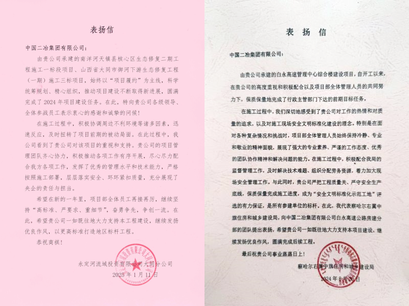 兩封表揚(yáng)信真摯誠(chéng)懇、情真意切,是對(duì)中國(guó)二冶高質(zhì)量施工管理和匠心鑄造精品工程的一致認(rèn)可。下一步,中國(guó)二冶將繼續(xù)發(fā)揚(yáng)“彰顯央企擔(dān)當(dāng),鑄就永恒精品”的企業(yè)使命,圓滿完成后續(xù)各項(xiàng)工作任務(wù),確保項(xiàng)目高質(zhì)量完美履約,為公司與業(yè)主交上一份滿意答卷。