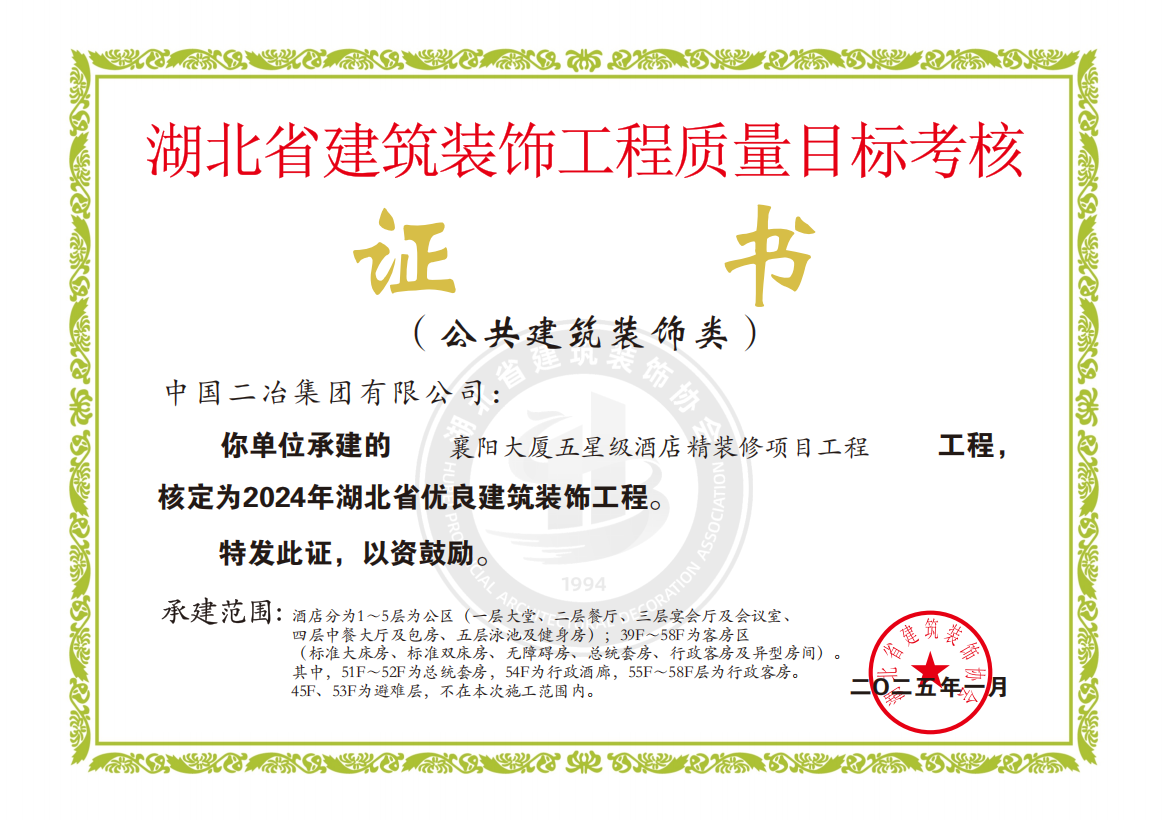 中國二冶一項目榮獲“湖北省優良建筑裝飾工程”獎