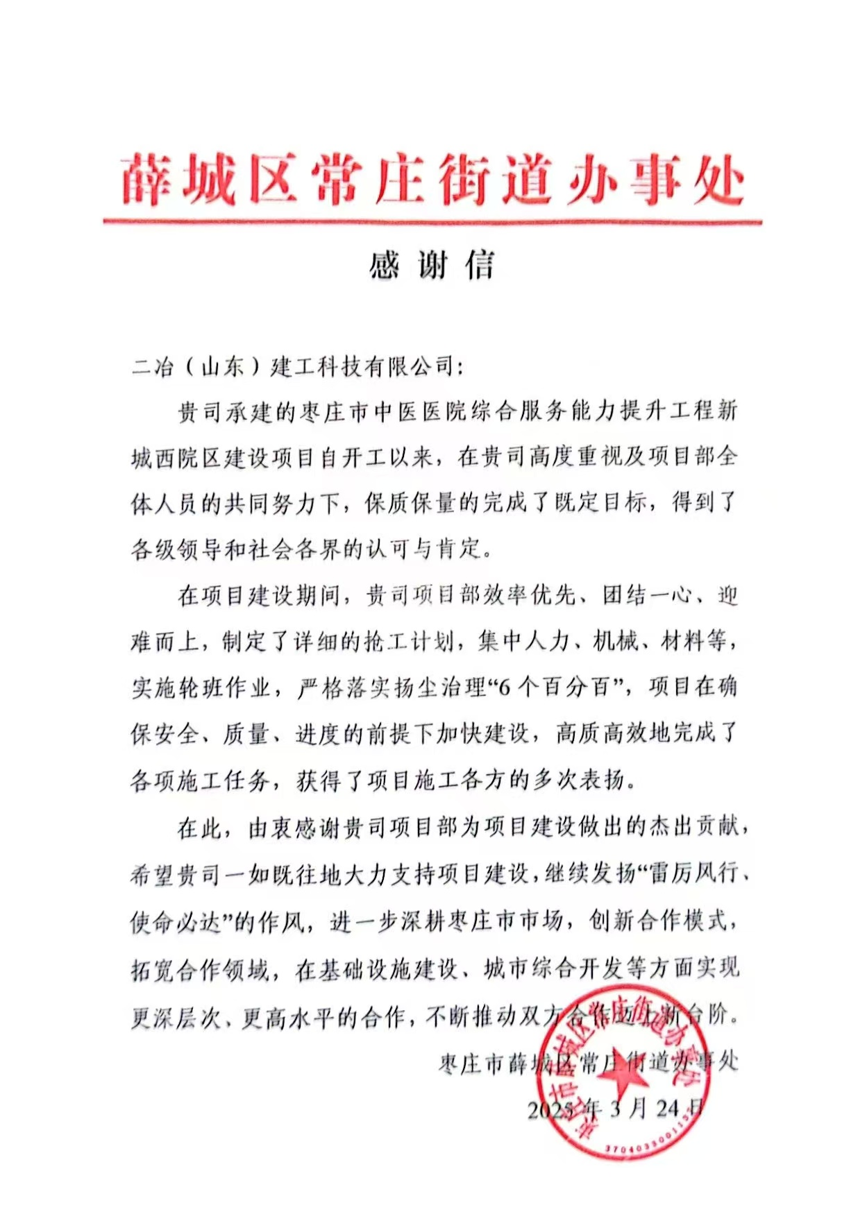 中國(guó)二冶收到棗莊市薛城區(qū)常莊街道辦事處感謝信