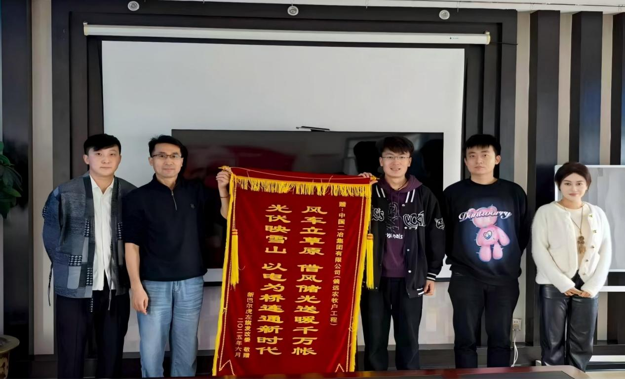 錦旗上題寫“風車立草原,借風儲光送暖千萬帳;光伏映雪山,以電為橋連通新時代”,生動詮釋了項目的核心價值與深遠意義。新巴爾虎左旗政府表示,該項目地處內蒙古偏遠牧區,氣候條件惡劣、交通出行不便,整體施工環境極為艱苦。面對挑戰,項目管理團隊充分發揮技術與管理優勢,始終以“高標準、高質量、高效率”為施工準則,全力克服物資運輸困難、極端天氣影響等多重難題,最終如期完成節點任務。該項目的順利推進,不僅成功解決了當地農牧民的急難愁盼問題,直接惠及數百戶農牧民家庭,顯著提升了牧區群眾的生活品質;更通過產業配套升級,為當地經濟可持續發展注入了新動能,為邊疆牧區發展奠定了堅實基礎。