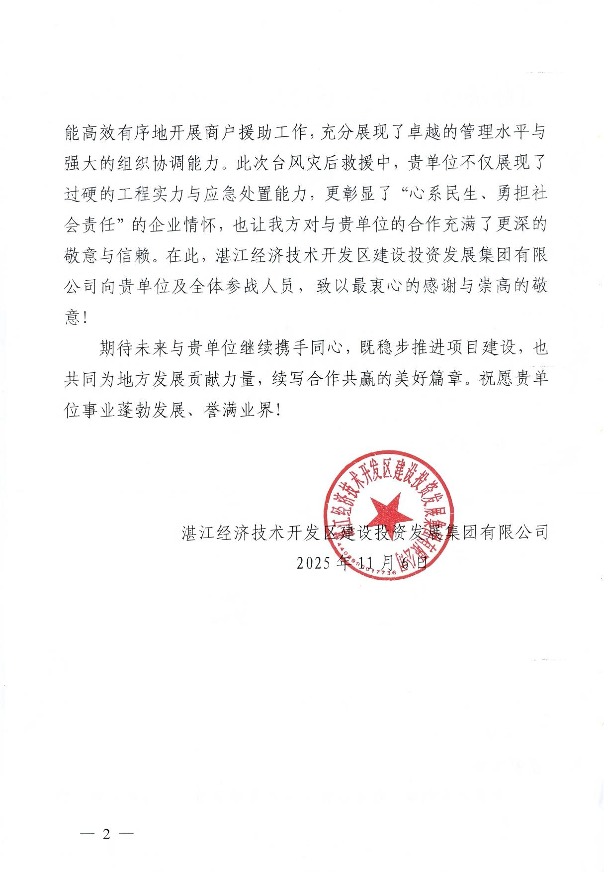 11月6日,中國二冶收到湛江經濟技術開發區建設投資發展集團有限公司發來的表揚信,對公司在臺風“麥德姆”過境后,火速馳援龍海天景區災后重建、助力商戶恢復生產生活的擔當精神給予高度贊譽。