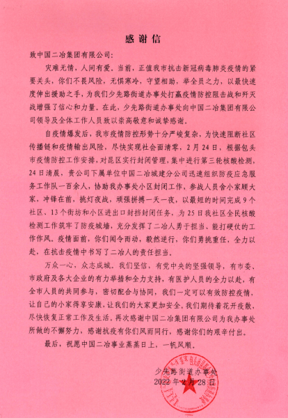 2月28日,包頭市昆區少先路街道辦事處致中國二冶感謝信,表揚中國二冶在抗擊新冠病毒肺炎疫情的緊要關頭,不畏艱險,無懼寒冷,齊心協力,共抗疫情,展現了中國二冶愛民為民、守土盡責、扛鼎重擔、召之必來,來之必戰的擔當與奉獻,特向中國二冶干部職工致以崇高敬意和衷心感謝!