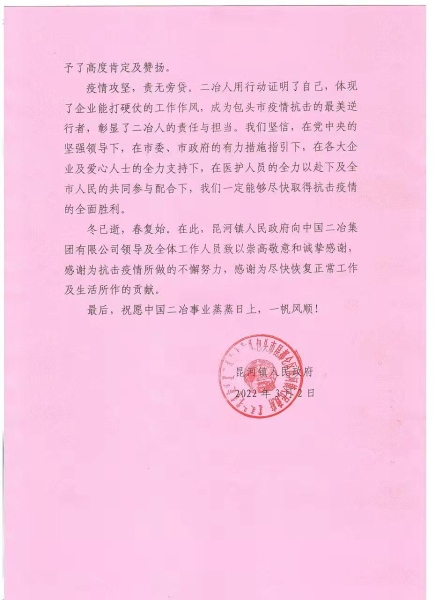 3月2日,昆河鎮人民政府向中國二冶發來感謝信,對中國二冶在全市全力阻擊新冠肺炎疫情擴散蔓延的緊要關頭,不畏風險,無懼寒冷,守望相助,齊心協力,以最快速度為昆河鎮快速阻斷社區傳播鏈和疫情輸出風險所做出的貢獻,對央企快速反應、雷厲風行的工作作風表示感謝。