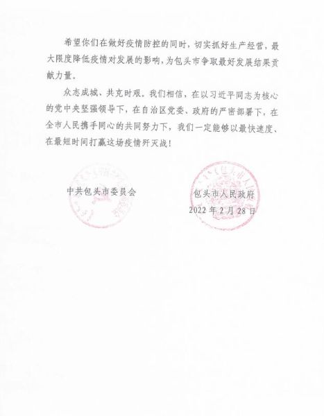 丹心寸意,皆為有情。中國二冶用風雨同舟、患難與共的深情,書寫著企地“同呼吸、共命運”的心意相牽;用同舟共濟、守望相助的行動,演繹著企地“手牽手、心連心”的深厚情誼。希望中國二冶在做好疫情防控的同時,切實抓好生產經營,最大限度降低疫情對發展的影響,為包頭市爭取好發展結果貢獻力量。